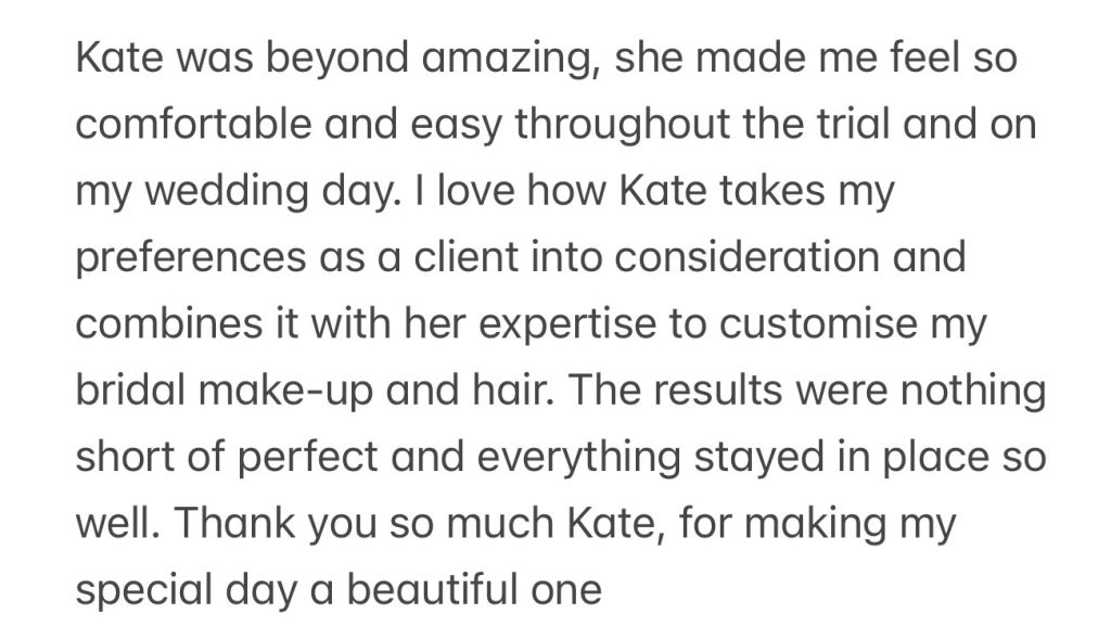 She uses high-end products, with NARS and Charlotte Tilbury being her go-to choices, to ensure her clients look and feel their best throughout their event or big day. Kate’s dedication to excellence and her passion for bridal beauty make her an exceptional choice for any bride.