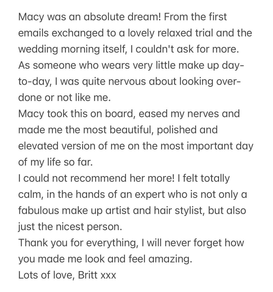 With a degree in Makeup and Hair Design, as well as a love for skincare – I believe great makeup starts with great skin! My style is all about enhancing your natural beauty, whether you’re after something soft and romantic or a bit more glam.