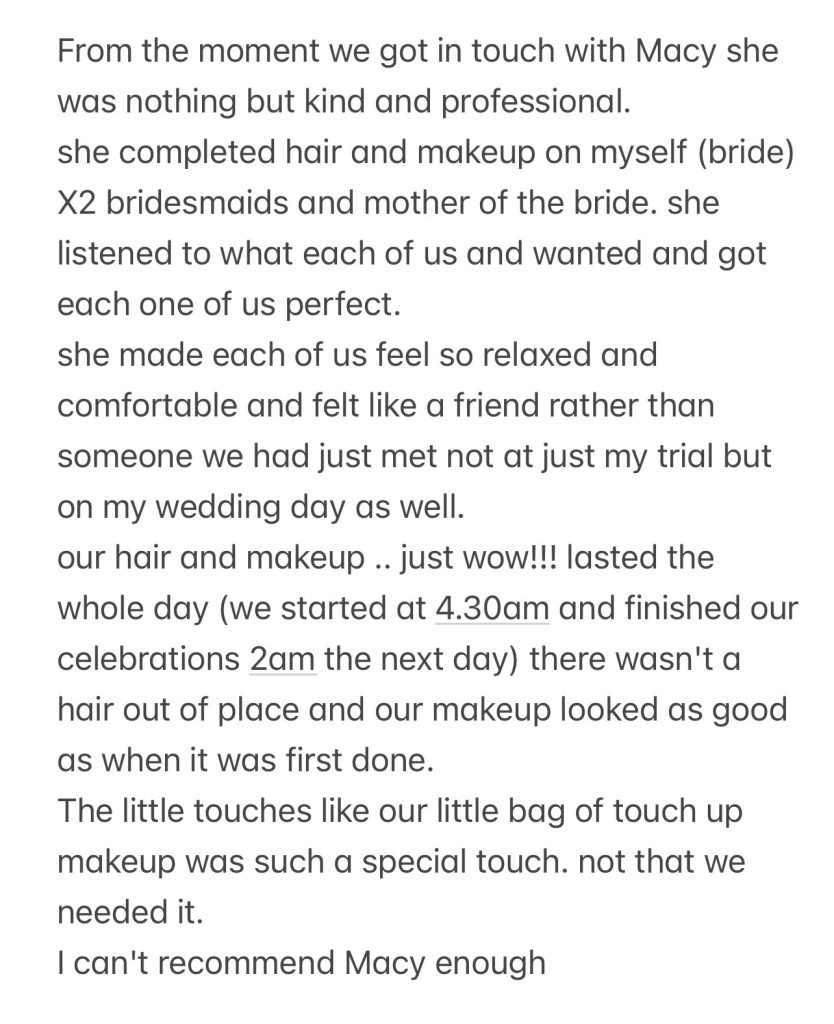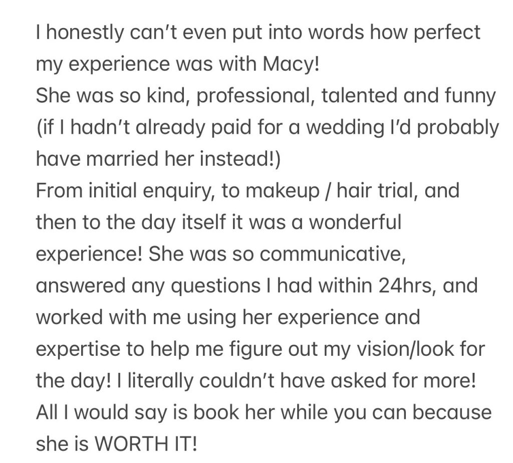 Hi, I’m Macy! I’m a makeup artist and hairstylist with over 6 years of experience as an artist, and I absolutely love what I do. There’s nothing more special to me than helping brides feel their most beautiful, confident, and relaxed on such a special day.